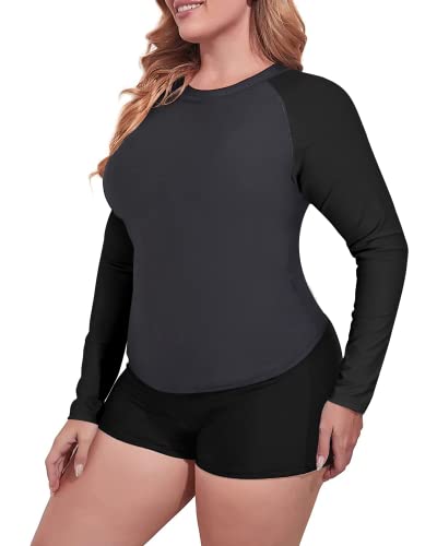 Make a statement at the beach with this fashionable yet practical women's plus size two piece rash guard swimsuit, complete with color block raglan sleeves and high waisted boyleg bottoms.