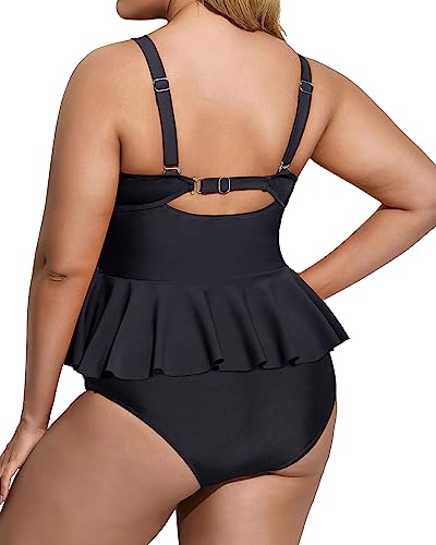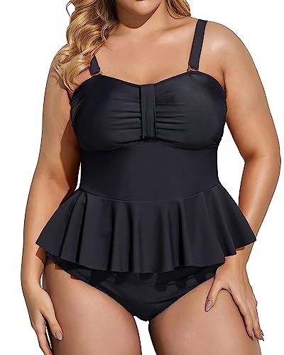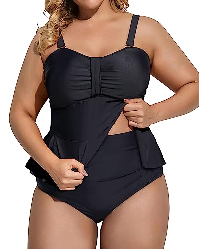 Plus size two piece swimsuits with peplum: This black vintage tankini features twist front design, removable padded push up bra and removable shoulder straps, you can wear as bandeau.This retro bikini set matches tummy control full coverage and ruched bottom, covering the stomach without showing too much. Special waist design shows your charming curves and makes you the center of crowd.