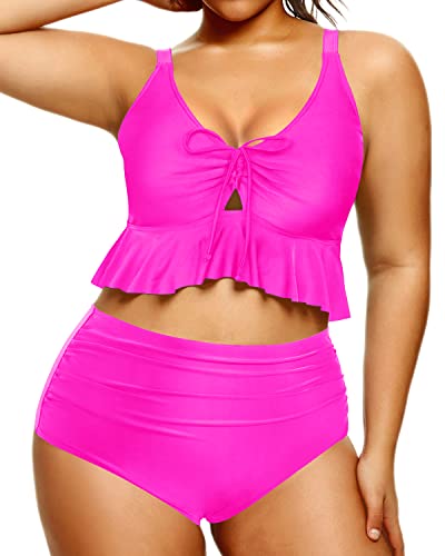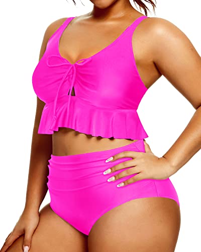 Ruffle Flounce High Waisted Bikini Set For Curvy Women-Neon Pink