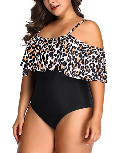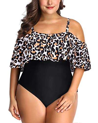 Flaunt your curves in this white leopard plus size one piece swimsuit, featuring a flounce overlay to cover imperfect upper arms and tummy control design for a flattering and slimming effect.